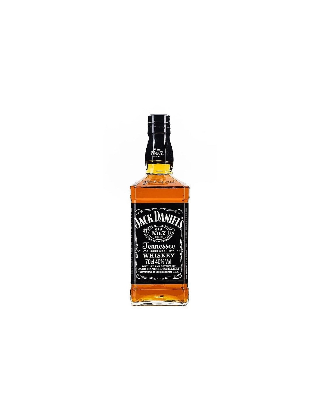 Jack Daniel’s Old No. 7 este un Tennessee whiskey emblematic, distilat in Lynchburg, SUA, si filtrat lent prin carbune de artar pentru a obtine gustul sau inconfundabil, fin si echilibrat. Este maturat in butoaie noi de stejar, arse la interior, proces care ii confera culoarea sa bogata si aromele profunde de caramel si vanilie.